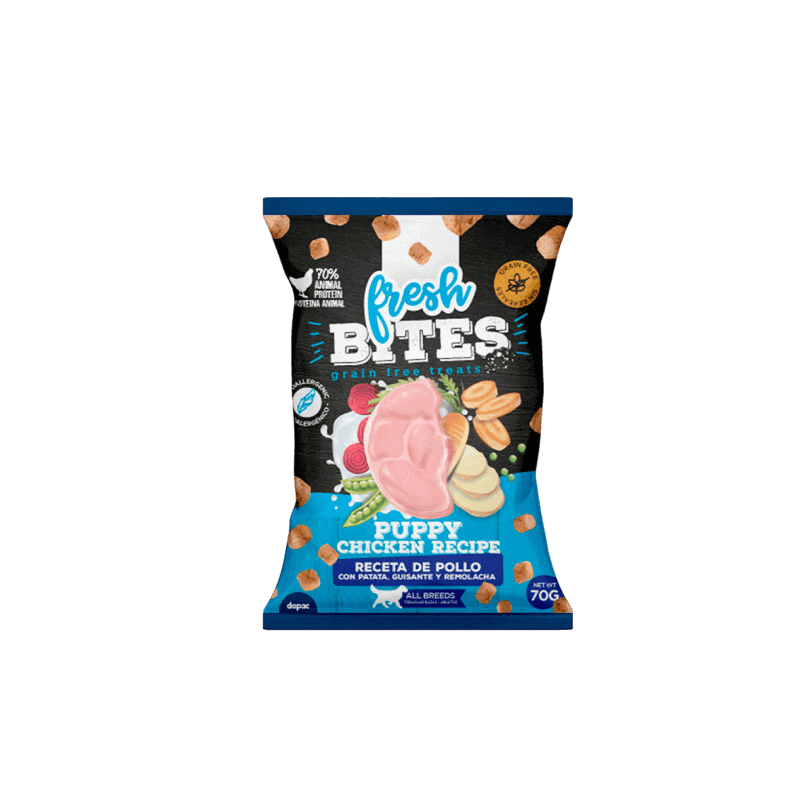Fresh Bites Grain Free Snacks Puppy Chicken Recipe son unos sabrosos y saludables snacks especialmente formulados para cachorros de todas las razas. Elaborados con un alto porcentaje de pollo fresco y harina de carne (70% proteína de origen animal), junto con patata, guisante y remolacha, estos bocaditos son 100% libres de cereales. Su receta, enriquecida con leche maternizada y zanahoria, es ideal como parte de su adiestramiento y para recompensar a tu pequeño compañero durante su crecimiento.