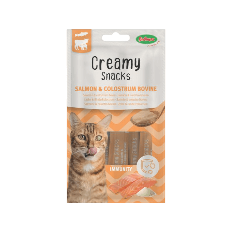 Los Creamy Snacks – Inmunity. Salmón y Calostro Bovino son ideales para gatos. Son perfectos para apoyar su sistema inmunitario. Para quienes buscan un snack hidratante y delicioso. Fortalecerá vuestro vínculo día a día.