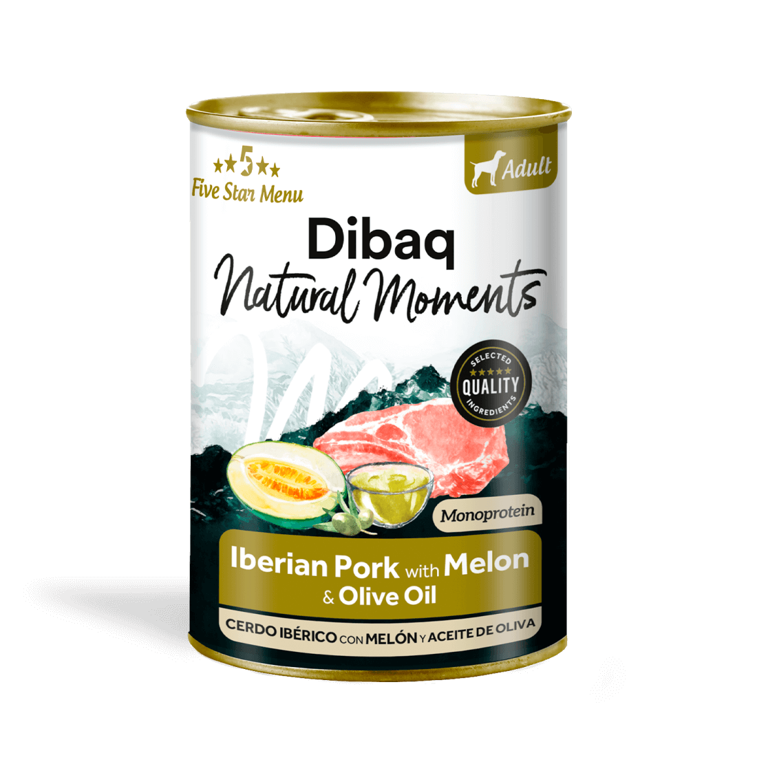 - Composición: Cerdo fresco 40%* (del cual ibérico 65%*), melón fresco 4%*, guisantes, sustancias minerales, aceite de oliva 0,1%*. (*Ingredientes naturales).