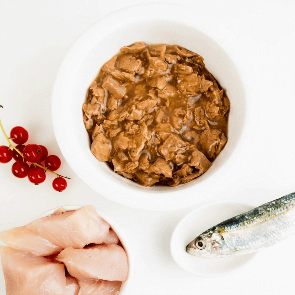 - Composición: Pollo 64%*, sardinas 20%*, almidón de tapioca 1,4%*, minerales, arándanos deshidratados 0,4%*, inulina (Prebiótico) 0,4%. (*Ingredientes naturales).