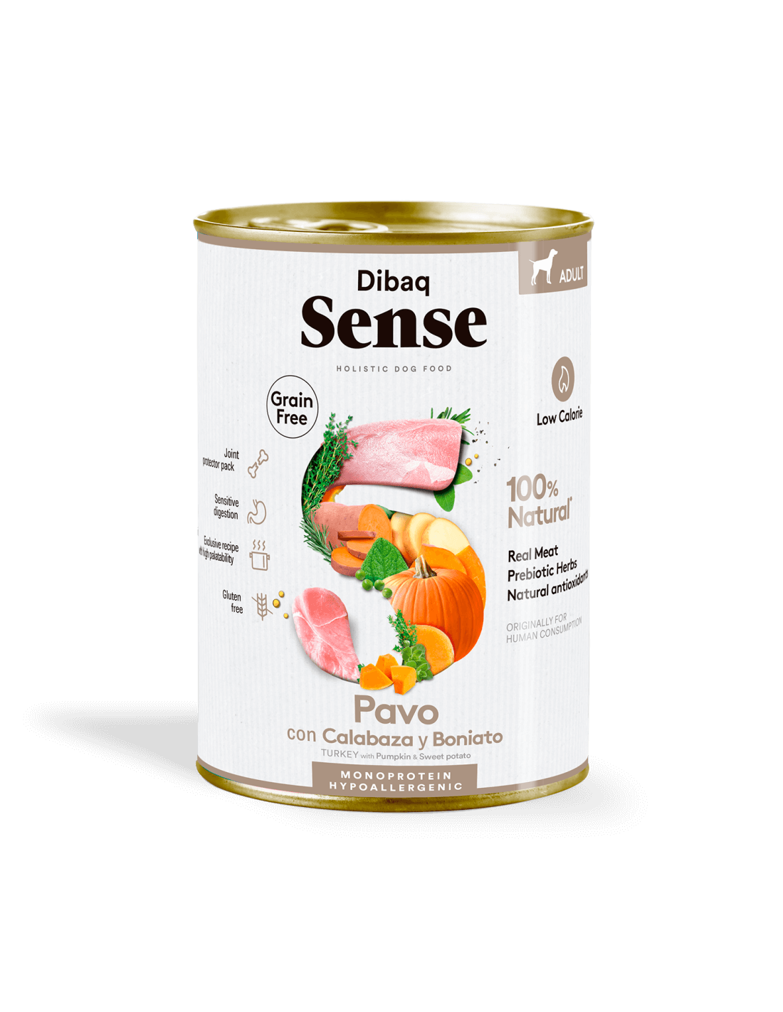 Dibaq Sense ofrece su Húmedo Perro Pavo Calabaza, un alimento completo hipoalergénico diseñado para perros adultos de todas las razas. De hecho, Dibaq lo ha cocinado sin cereales (Grain Free) con ingredientes aptos para consumo humano.
