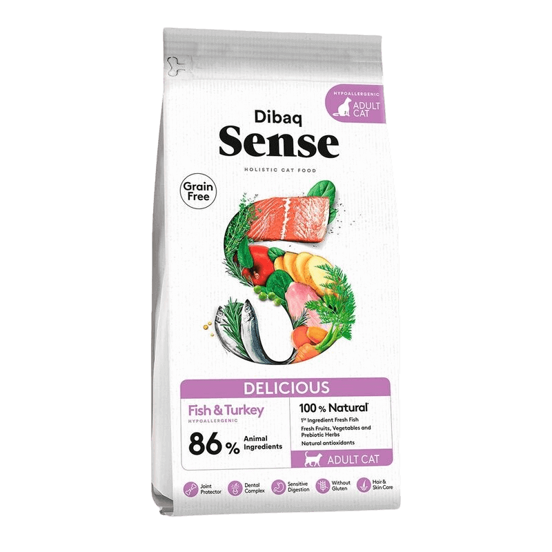 Dibaq Sense presenta su Pienso Gato Delicious Pescado, un alimento natural y sin cereales diseñado para gatos adultos de todas las razas con paladares exigentes que disfrutan de los sabores del mar. De hecho, esta receta cuenta con un impresionante 86% de ingredientes de origen animal y 40% de pescado fresco (Salmón y Arenques).