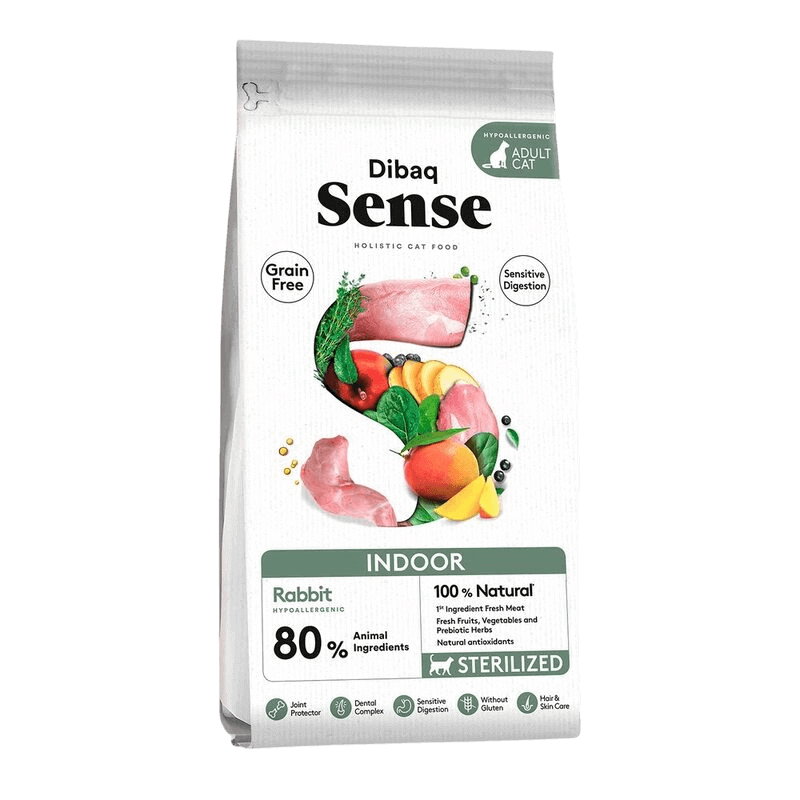 Dibaq Sense presenta su Pienso Gato Indoor Conejo, la fórmula completa y equilibrada, sin cereales, diseñada específicamente para gatos adultos con un estilo de vida de interior. De hecho, esta receta utiliza Conejo Fresco (35%) como ingrediente principal, una carne magra de fácil digestión.