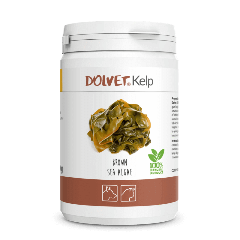 Dolvet Kelp es un suplemento natural y altamente nutritivo, compuesto principalmente por algas marinas marrones Ascophyllum Nodosum (kelp noruego) y enriquecido con levadura de cerveza seca. Esta fórmula única es una fuente excepcional de vitaminas, aminoácidos, minerales y ácidos grasos esenciales, además de ser una de las mejores fuentes naturales de yodo. Su rica composición apoya diversos sistemas del organismo de perros y gatos, incluyendo el digestivo, óseo, sanguíneo, urinario, la salud de la piel y el pelaje, y contribuye a mantener la higiene bucal.