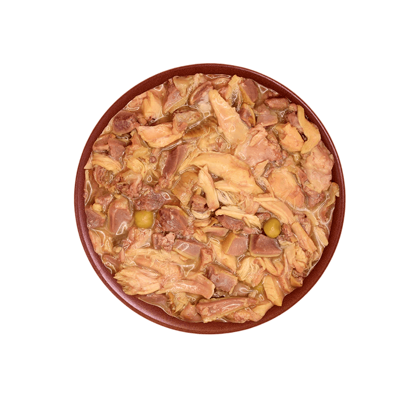 COMPOSICIÓN: 97% Pato fresco en su salsa, boniato, guisantes, zanahoria, perejil, cúrcuma, tomate, especias.