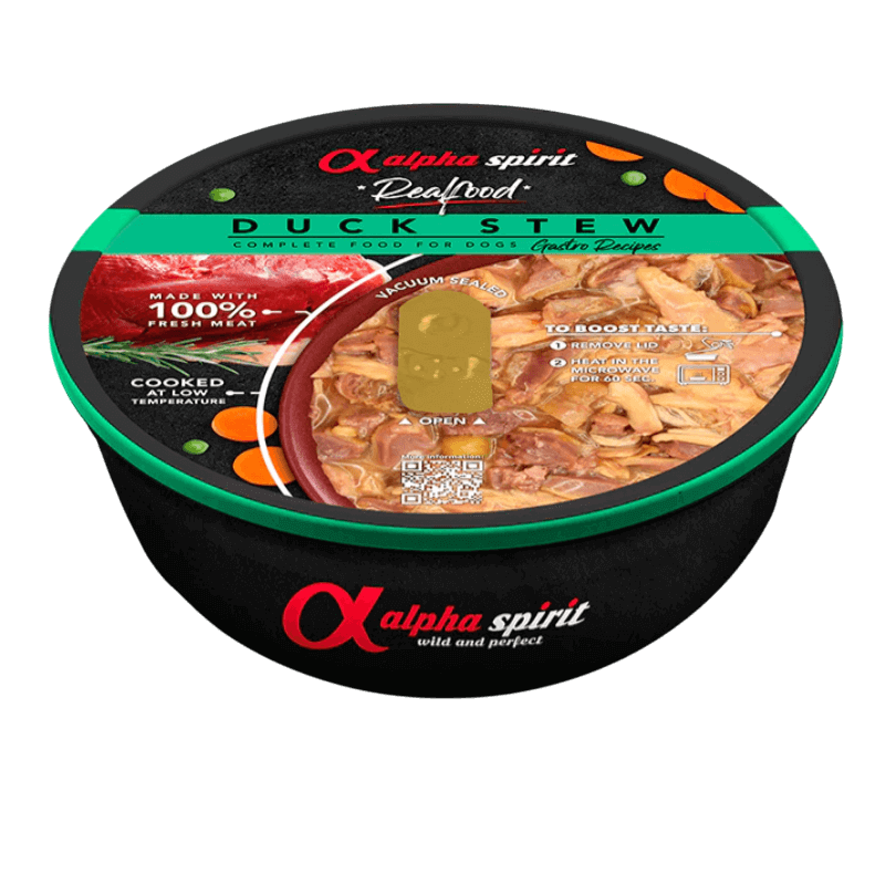 El Estofado Pato Sin Cereales Perro Alpha Spirit es un alimento húmedo completo de alta calidad, formulado para la nutrición diaria de tu mascota. Su receta destaca por un impresionante 97% de Pato Fresco en su Jugosa Salsa, garantizando un sabor intenso y natural que encantará incluso a los perros más exigentes.