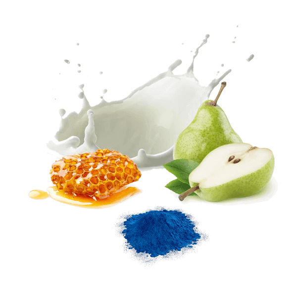 Composición: Kéfir de cabra (30%), Manzana, Pera (10%), Coco, Miel cruda de Romero (4%), Espirulina azul (0,04%).