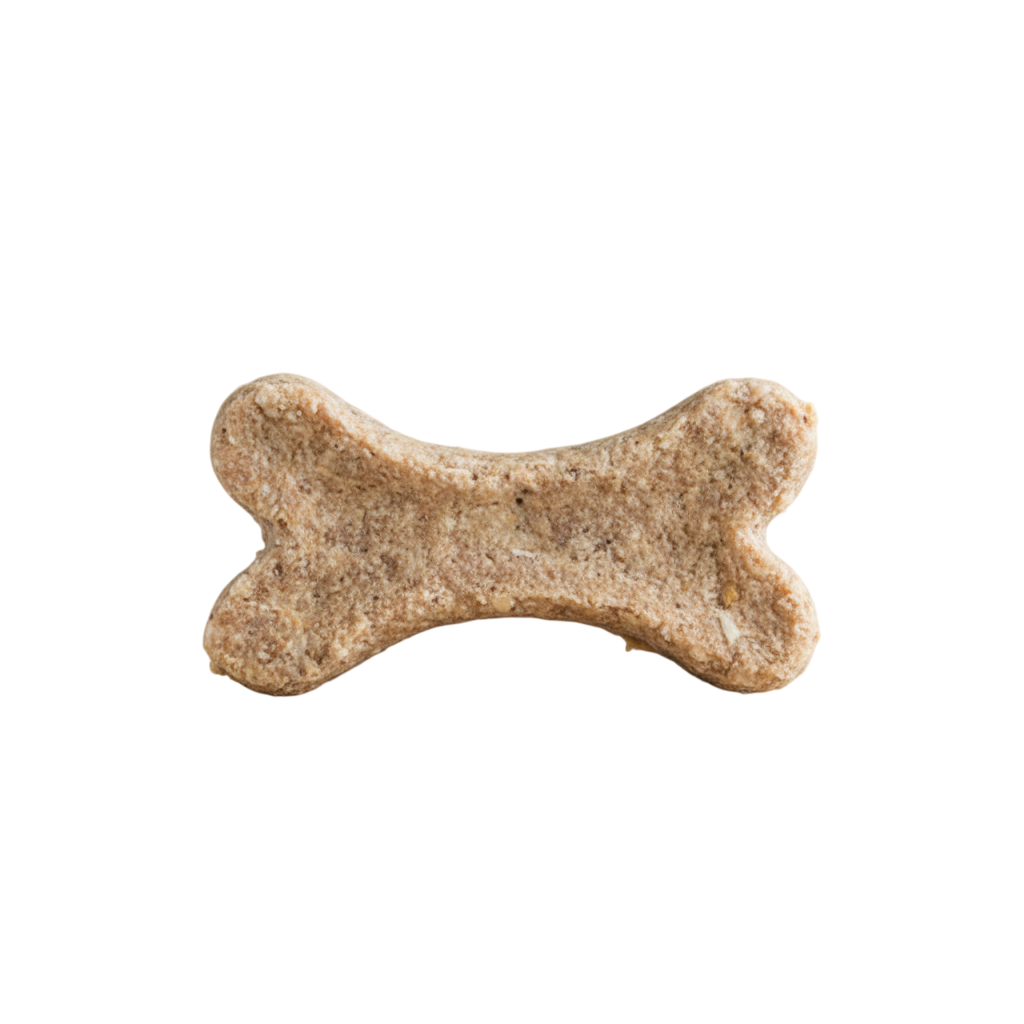 Alimento complementario para perros. Los huesitos no contienen colorantes añadidos y están envasadas en envases 100% reciclables.