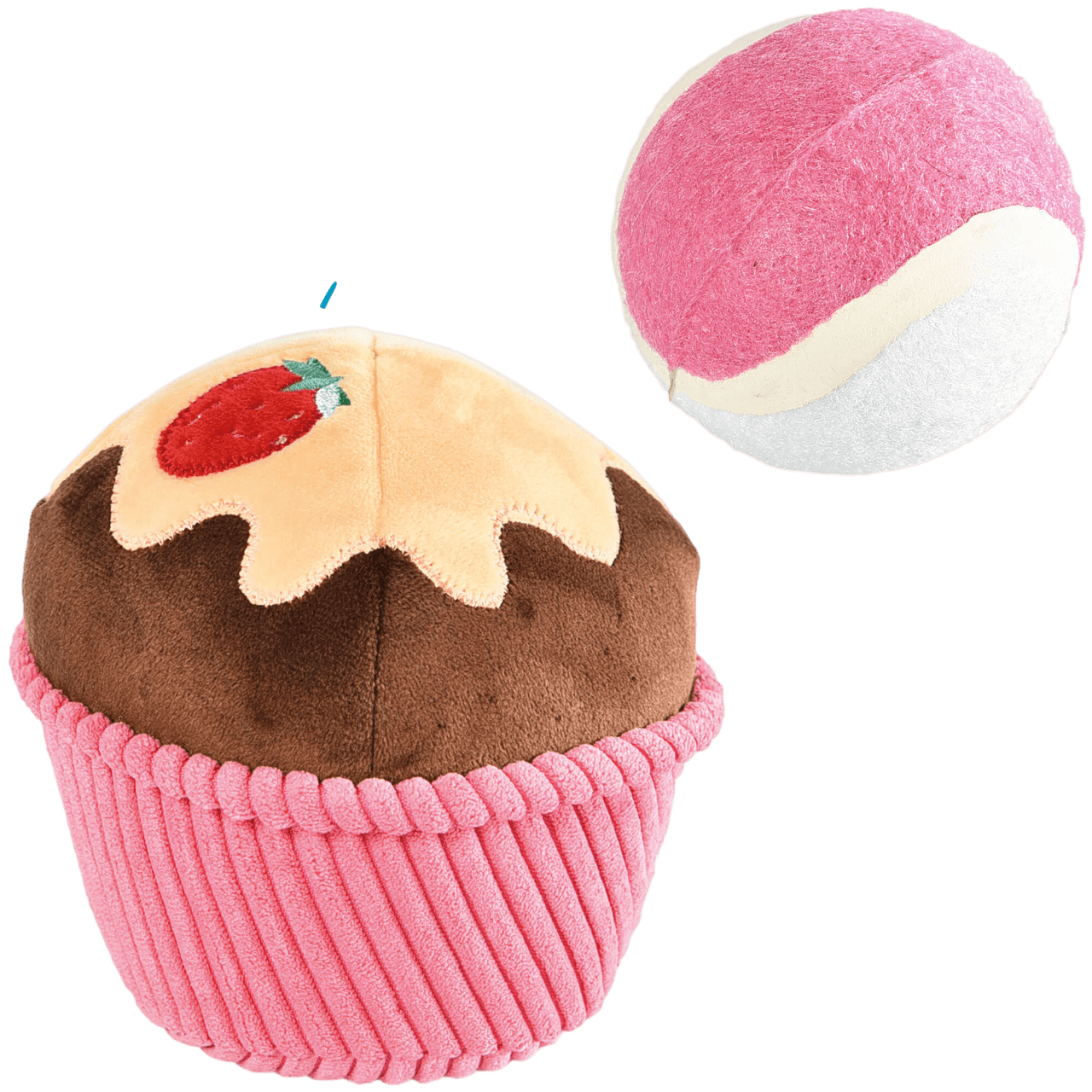 ¡Doble ración de diversión! Deja que tu perro disfrute de este delicioso cupcake de peluche y descubra la sorpresa que esconde en su interior.