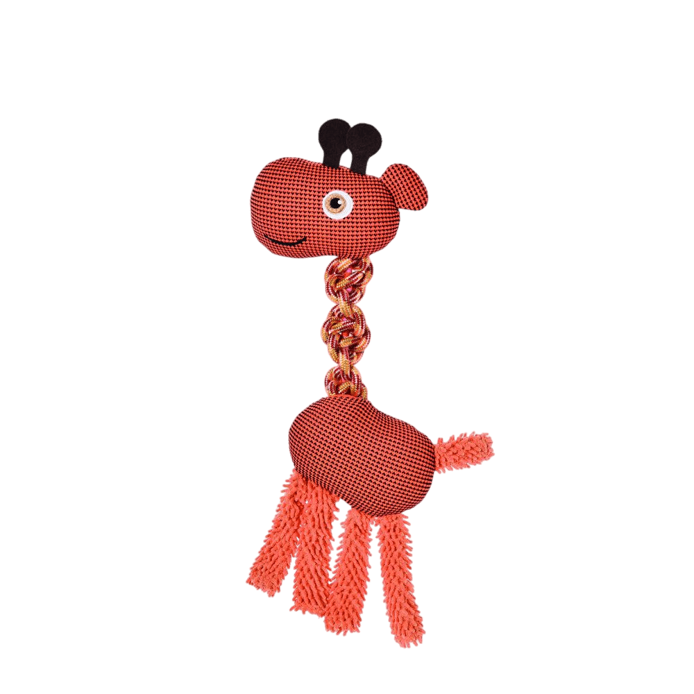 El diseño del Peluche Jirafa con Cuerda resulta muy práctico. La cabeza y el cuerpo tienen un tejido suave, mientras que el cuello incorpora una cuerda trenzada robusta. Por esta razón, el perro puede agarrarla bien durante el juego interactivo y elástico. Asimismo, su principal cualidad es el mecanismo interno que le permite estirarse y retraerse gracias a un resorte fuerte. Este movimiento impredecible simula la emoción de la persecución. Por lo tanto, mantiene a tu perro concentrado y motivado.