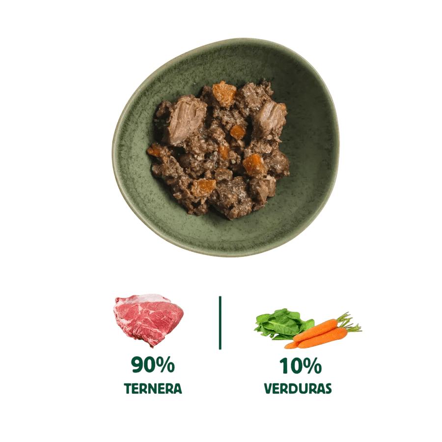 - Composición: 90% Ternera (50% carne picada, 15% hueso con tuétano, 15% corazón, 5% hígado, 5% riñón), 7% Zanahoria y 3% Espinaca. Contiene huesos triturados para una alimentación completa.