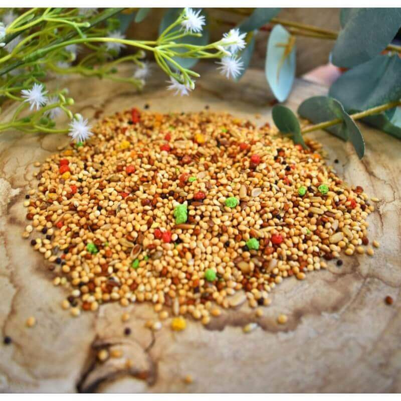 - Composición: Mijo, mijo rojo, avena repelada, nabina, alpiste, linaza, gránulo panificado y alimento extrusionado.