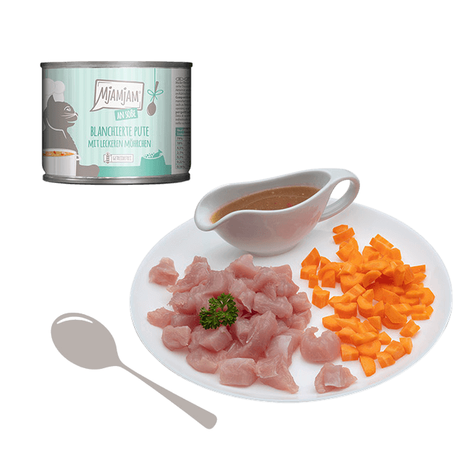 COMPOSICIÓN: 68% de pavo (de carne de músculo 32%, corazones, hígados, canales, estómagos), caldo de pavo (27%), zanahorias (4%), minerales, aceite de salmón (0,2%).