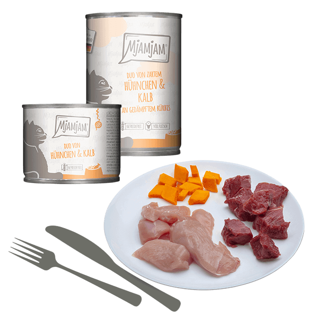 Esta fórmula ofrece un extra alto contenido de carne (70% total), combinando Pollo (56% de carne y órganos) con Ternera (14% de carne y pulmones). La adición de Calabaza (4%) al vapor aporta vitaminas y un toque suave. Es una fórmula pura: sin cereales, azúcar, conservantes ni aditivos artificiales. Su alto valor calórico (124,2 kcal/100g) y el contenido de Taurina (1.500 mg/kg) aseguran la vitalidad y el bienestar general.