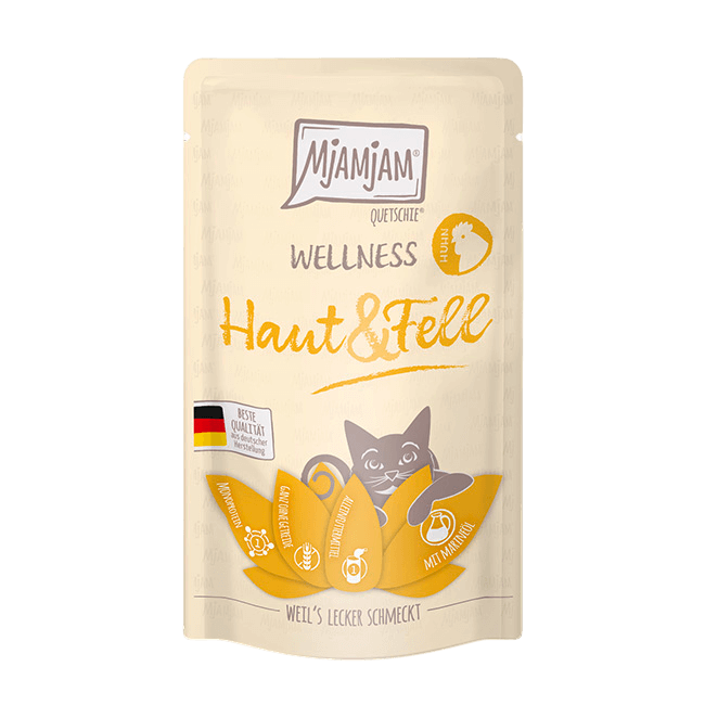 ¡Suavidad de seda y un brillo espectacular! MjAMjAM Wellness Pollo Piel y Pelaje es la receta ideal para consentir a tu gato con un tratamiento de belleza nutritivo y delicioso.