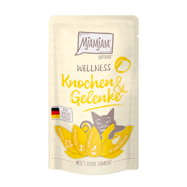 ¡Bienestar en cada bocado! Con MjAMjAM Wellness Ternera, no solo alimentas a tu gato, sino que cuidas activamente su agilidad y salud articular con una receta irresistible.