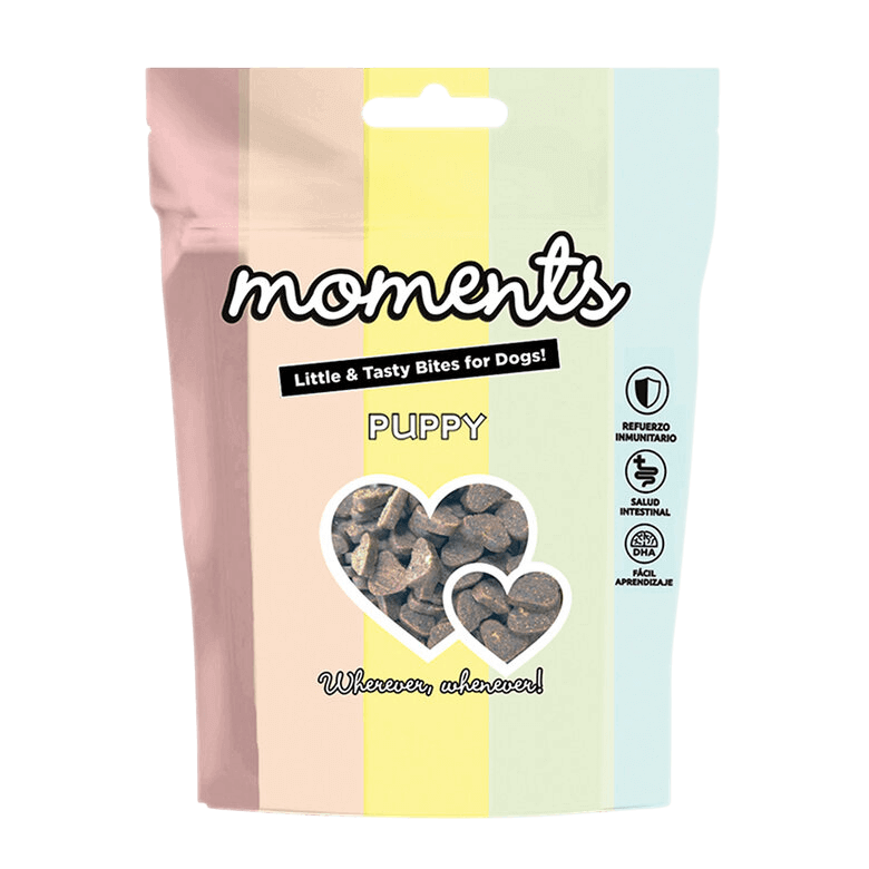 Moments Puppy Salmón son unos fantásticos snacks con formas divertidas y un irresistible sabor a salmón fresco, especialmente diseñados para cachorros. Formulados sin cereales ni transgénicos y enriquecidos con DHA, son el premio perfecto para consentir y educar a tu pequeño compañero durante su etapa de crecimiento.