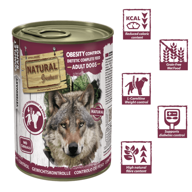 Natural Greatness Obesity Control Perro Húmedo es la solución natural para el control de peso de tu perro. Esta fórmula húmeda hipoalergénica y sin cereales está diseñada para ayudar a perros con sobrepeso, obesidad, diabetes mellitus, o trastornos digestivos asociados (colitis, estreñimiento).