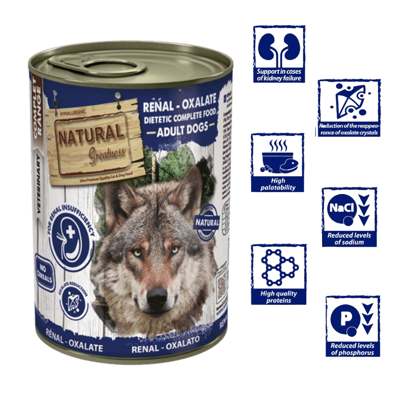 ¿Tu perro sufre de Insuficiencia Renal Crónica (IRC) o tiene tendencia a formar cálculos de oxalato? Natural Greatness Renal Oxalato Perro es un alimento húmedo completo y equilibrado, formulado específicamente para apoyar la función renal de perros júnior y adultos.