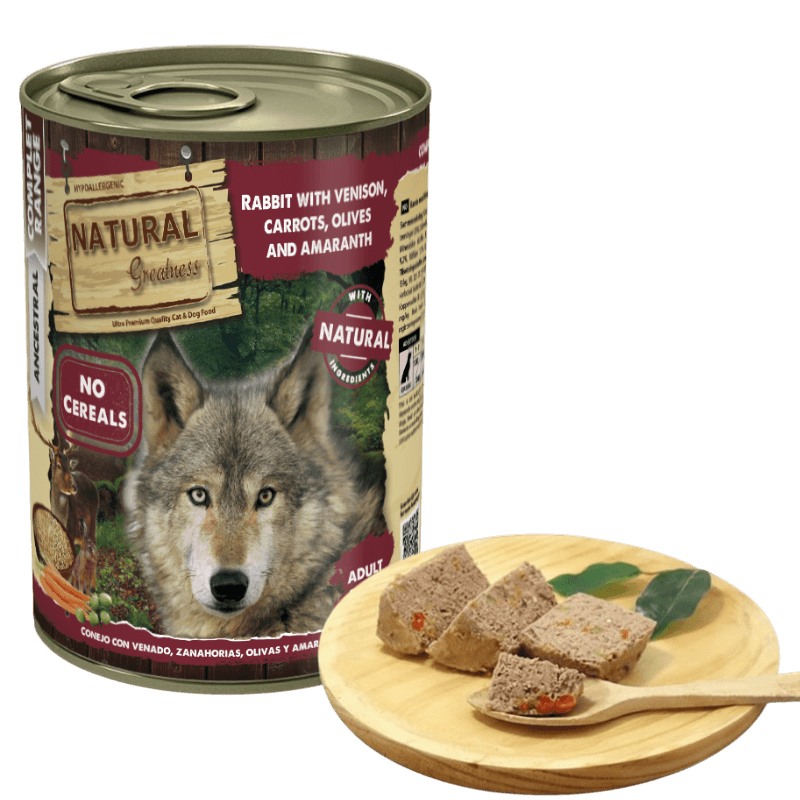 Natural Greatness Húmedo Conejo Venado Perro es un alimento completo, Ultra Premium e hipoalergénico diseñado para perros adultos de todas las razas. Es una opción deliciosa para paladares exigentes y dietas sensibles.