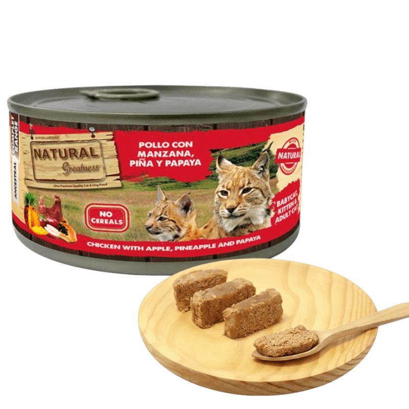 Natural Greatness Húmedo Gato Pollo Piña es una fórmula completa y Ultra Premium diseñada para la vitalidad de tu felino (apta para gatitos y adultos). Esta receta sin cereales e hipoalergénica se basa en Carne de Pollo (66%) y se enriquece con frutas funcionales.