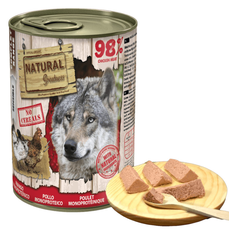 Natural Greatness Húmedo Monoproteico Pollo Perro es un alimento completo, Ultra Premium y sin cereales diseñado para perros adultos con sensibilidad alimentaria o que requieren una dieta de exclusión controlada.