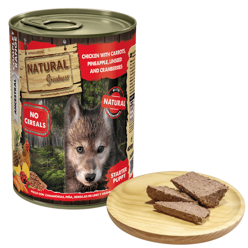 Natural Greatness Húmedo Starter Puppy Cachorro es un alimento completo y delicioso, especialmente diseñado para cachorros de todas las razas desde el destete. Esta fórmula monoproteica a base de Pollo (55%) es sin cereales e hipoalergénica, garantizando una nutrición completa para el crecimiento y desarrollo óptimo.