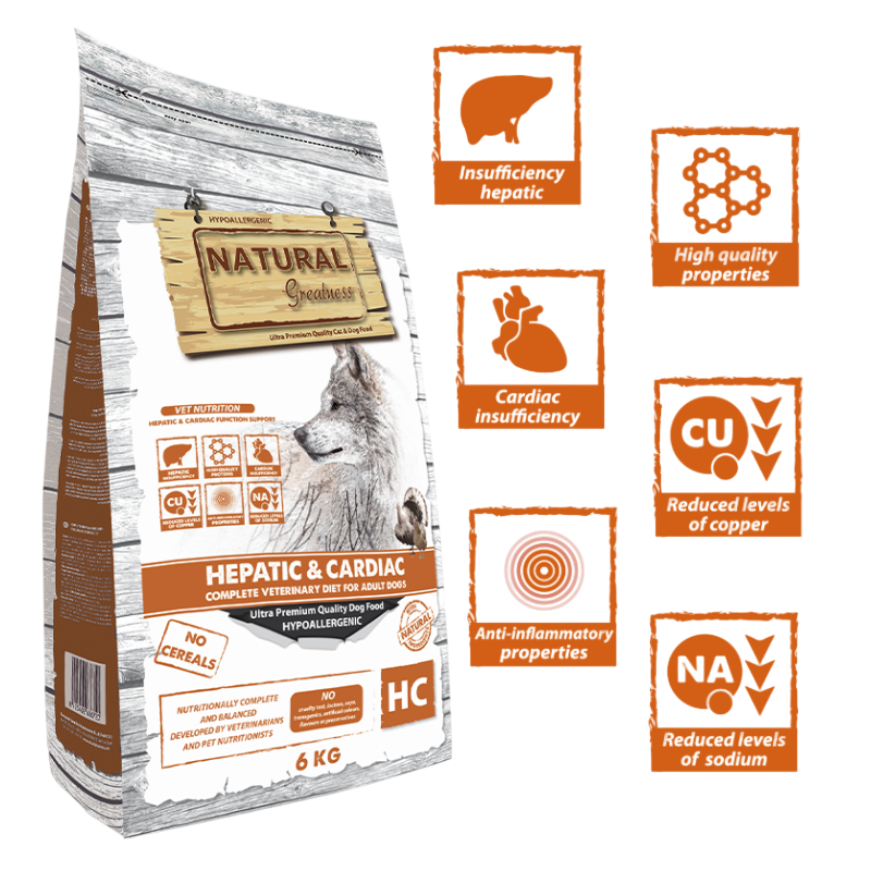 Si buscas un Pienso Hepático Cardíaco Perro de alta calidad, Natural Greatness Hepático y Cardíaco es el alimento dietético completo que necesitas. Formulado para perros adultos con insuficiencia hepática crónica y problemas cardíacos, esta dieta sin cereales reduce la carga de trabajo del hígado. Gracias a su bajo contenido en cobre y sodio, es la elección ideal para el manejo nutricional de estas patologías.