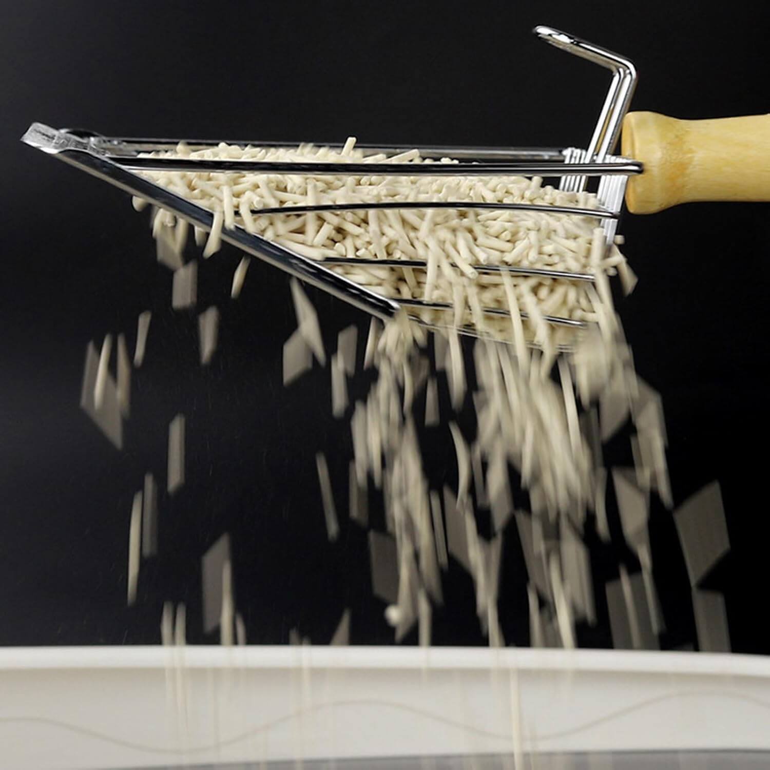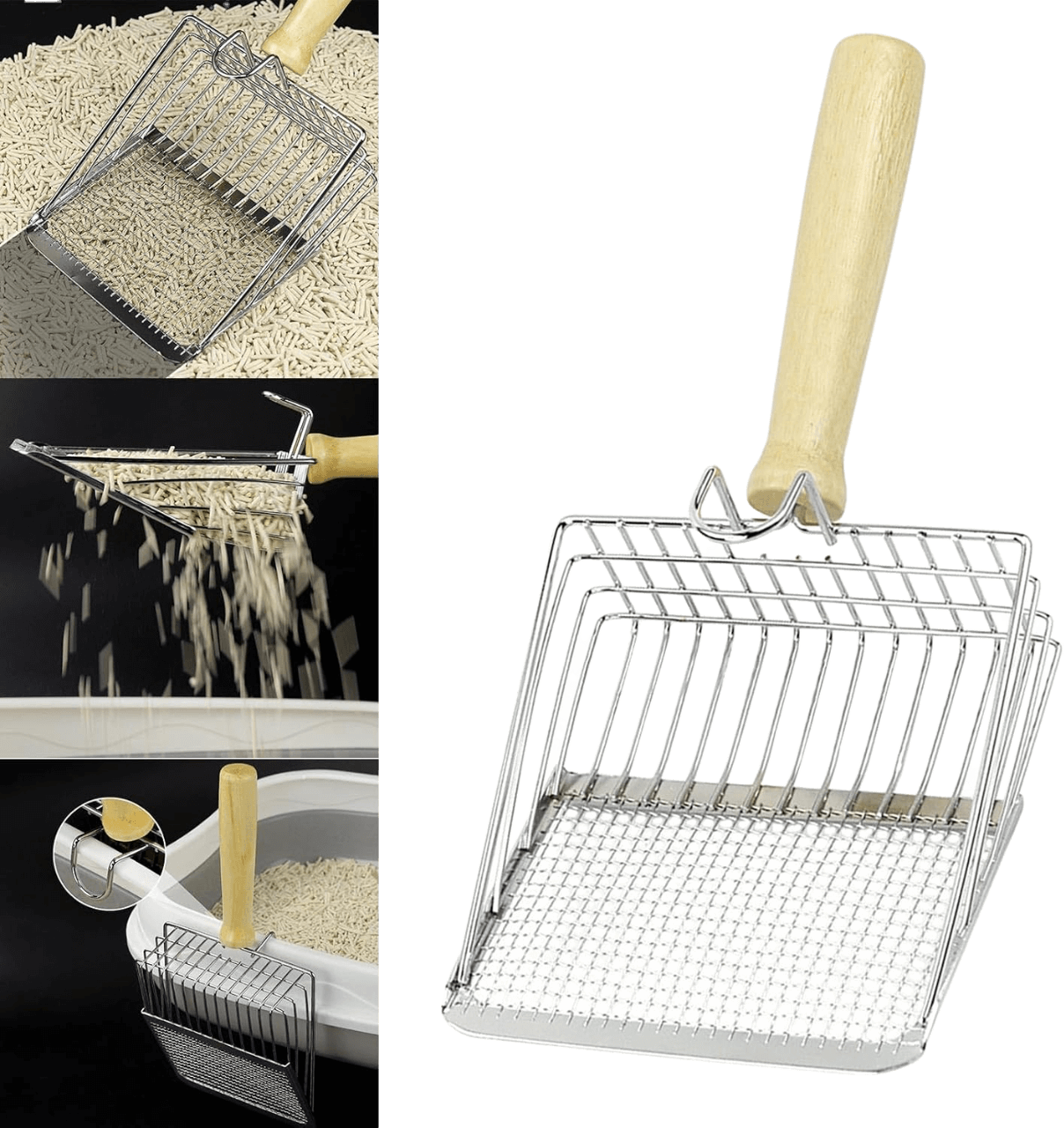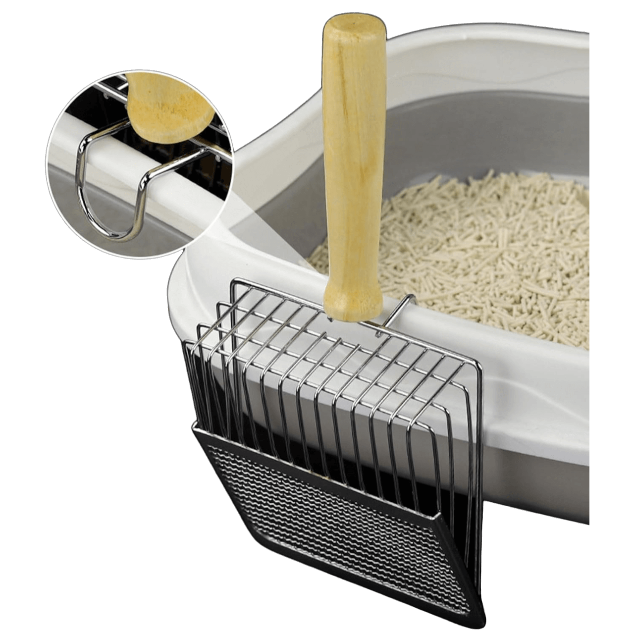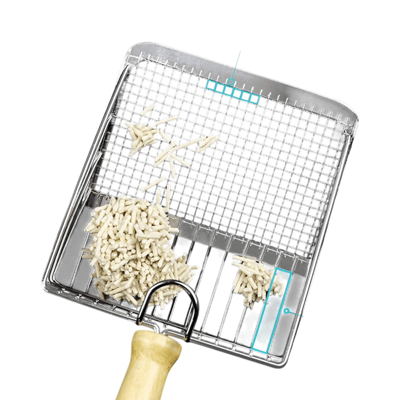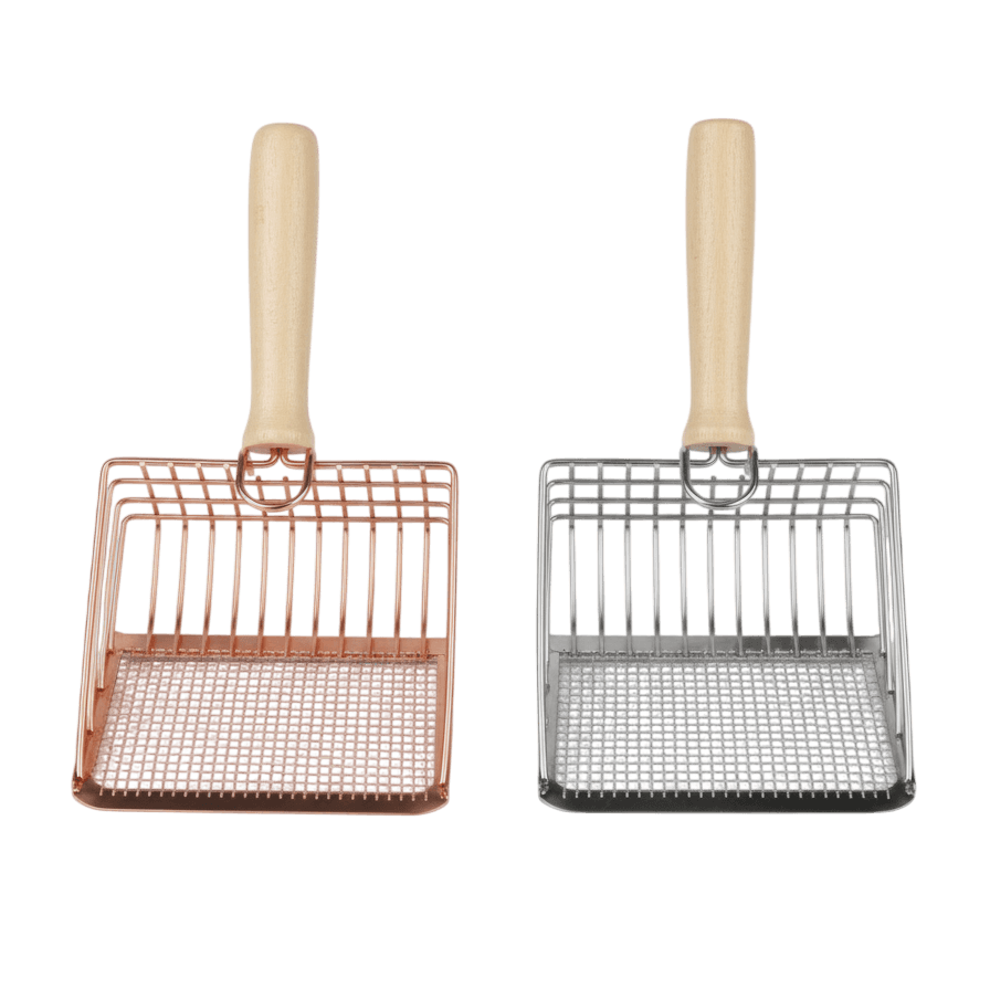 En Anlú buscamos productos de calidad. Esta pala, fabricada en metal de primera calidad con un elegante mango de madera ergonómico, destaca por su sistema de rejilla dual. La zona frontal con rejilla fina es ideal para filtrar arena de bentonita (aglomerante), mientras que la rejilla de la parte posterior permite gestionar perfectamente las arenas de pellet o maderas.