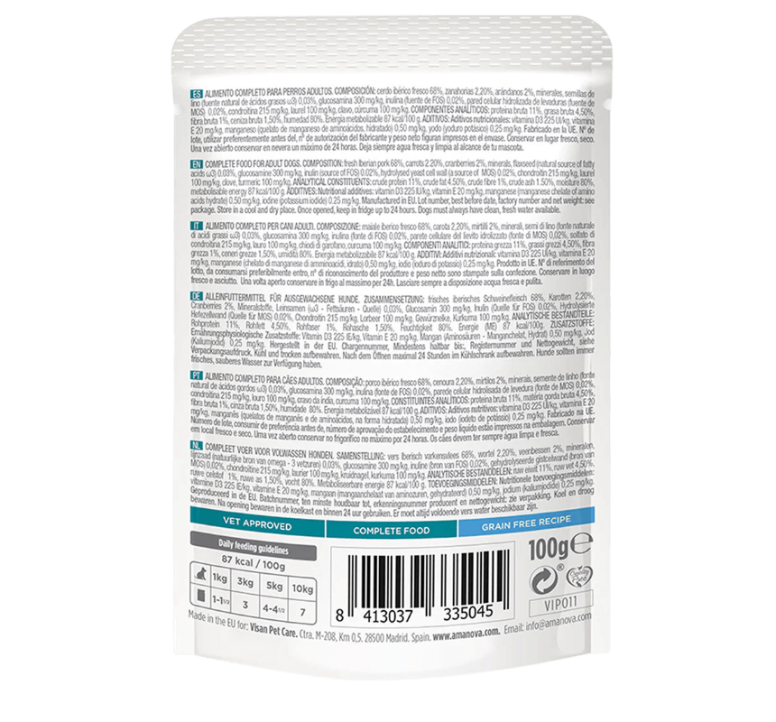 El Amanova Paté Cerdo Ibérico es un alimento húmedo de lujo, completo y equilibrado, diseñado para el perro adulto que merece lo mejor. Este delicioso Paté Cerdo Ibérico Monoproteico destaca en el mercado por su ingrediente principal: un exquisito 68% de Cerdo 100% Ibérico Fresco. Esta alta concentración de carne no solo asegura un sabor excepcional que los perros aman, sino que también lo convierte en una opción monoproteica pura. Al ser Grain Free, es la elección ideal para dietas de descarte o para perros con sensibilidad a proteínas animales más comunes o a los cereales.