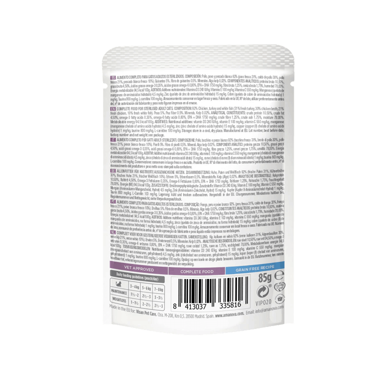 El Amanova Paté Pescado y Pavo Esterilizado en formato pouch es un alimento completo y delicioso, cocinado a fuego lento para una máxima conservación de nutrientes. Este Paté Gato Esterilizado Pescado está formulado específicamente para ayudar a tu felino a mantener su peso ideal después de la esterilización, con solo 94,5 kcal/100g.
