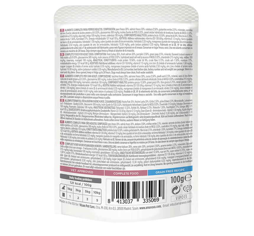 Composición Clave: Pavo Fresco 35%, Salmón Fresco 30%, Calabaza 2,5%, Guisantes. Enriquecido con Glucosamina, Condroitina, Alga Kelp, Ortiga, Romero y Caléndula.
