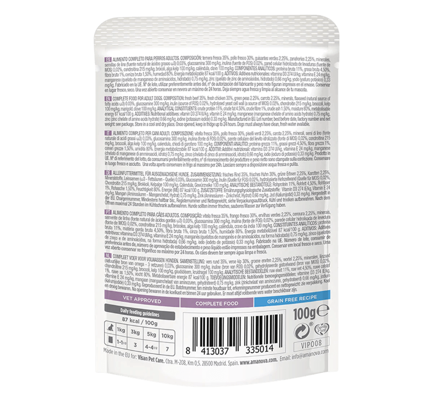 El Amanova Paté Ternera y Pollo Articular es un alimento húmedo completo y un delicioso Paté Ternera Pollo Articular Perro de alta palatabilidad, diseñado para perros adultos de todas las razas. En Anlú, valoramos las dietas basadas en la calidad de la proteína y la inclusión de ingredientes funcionales que realmente beneficien a tu mascota.