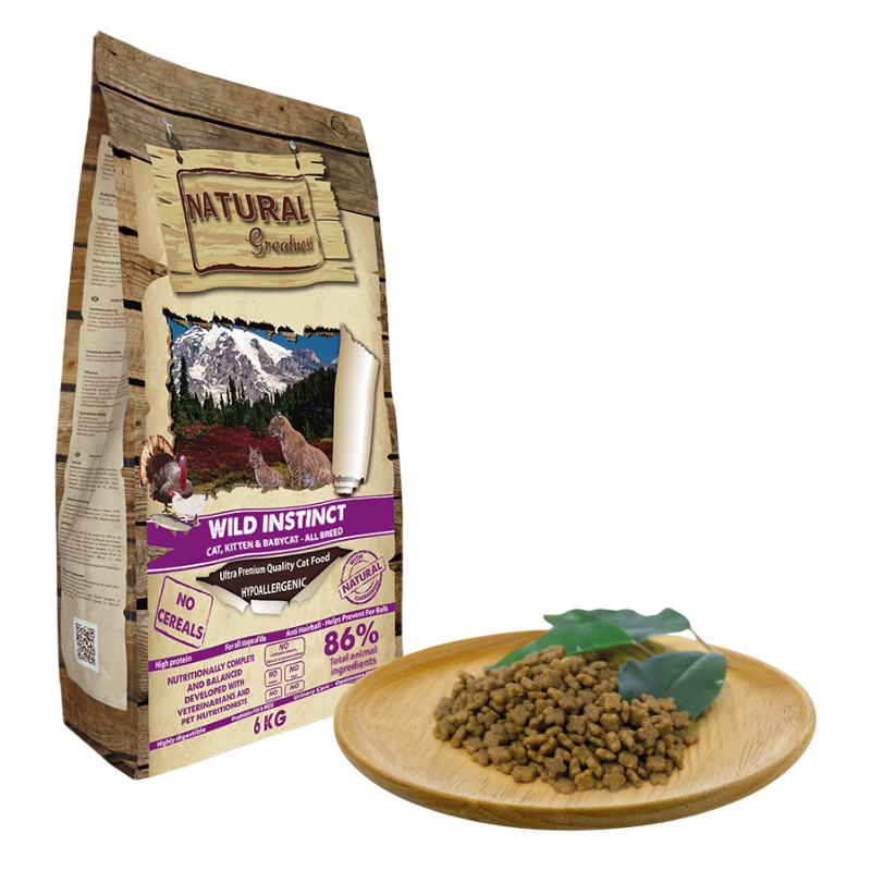 El Pienso Gatito Alta Proteina de Natural Greatness (Wild Instinct) es un alimento completo Ultra Premium formulado sin cereales para satisfacer las altas demandas nutricionales de Gatitos (a partir de 1 mes), Gatas Gestantes y Gatos Adultos activos. Esta fórmula está adaptada a la naturaleza carnívora del felino, ofreciendo un bajo nivel de carbohidratos (20.6%).