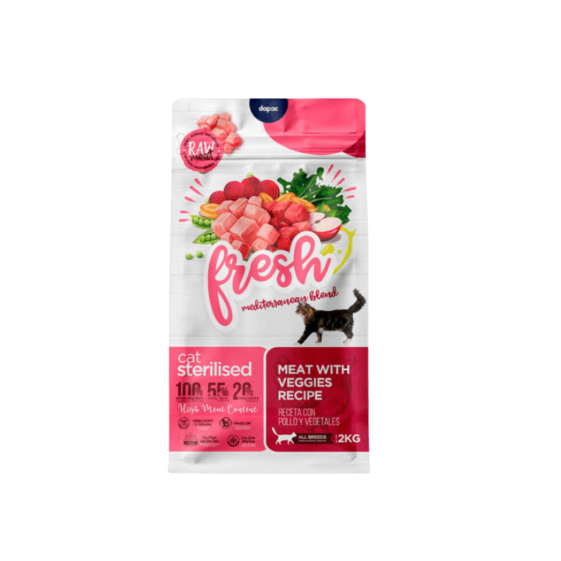 Fresh Mediterranean Esterilizado es un alimento seco completo y equilibrado, diseñado específicamente para satisfacer las necesidades nutricionales de los gatos adultos que han sido esterilizados. La esterilización ralentiza el metabolismo, lo que incrementa el riesgo de sobrepeso y problemas urinarios. Este Pienso Gato Esterilizado Pollo aborda estas preocupaciones con una fórmula especializada.