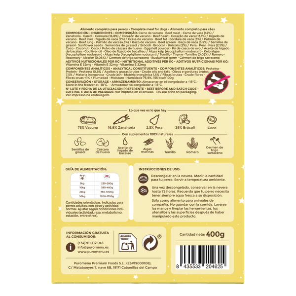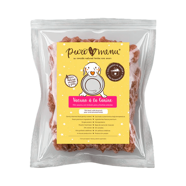 El Puromenu Vacuno Monoproteico es una Comida Vacuno Cocinada Monoproteica Perro, completa y equilibrada. Cocinada al vapor a baja temperatura, este menú conserva la máxima retención de nutrientes, ofreciendo una digestibilidad superior ideal para perros que necesitan la potencia de la carne roja. Contiene 75% de Vacuno (músculo, corazón, hígado, etc.) como única fuente de proteína, siendo ideal para dietas de exclusión o sensibilidad.