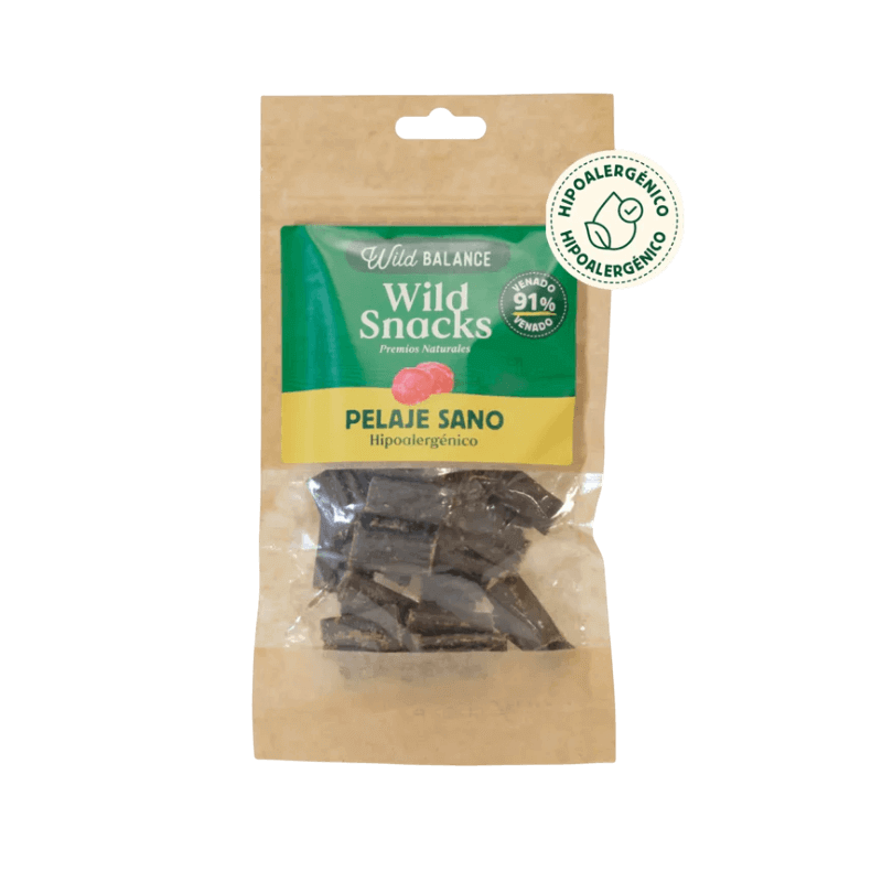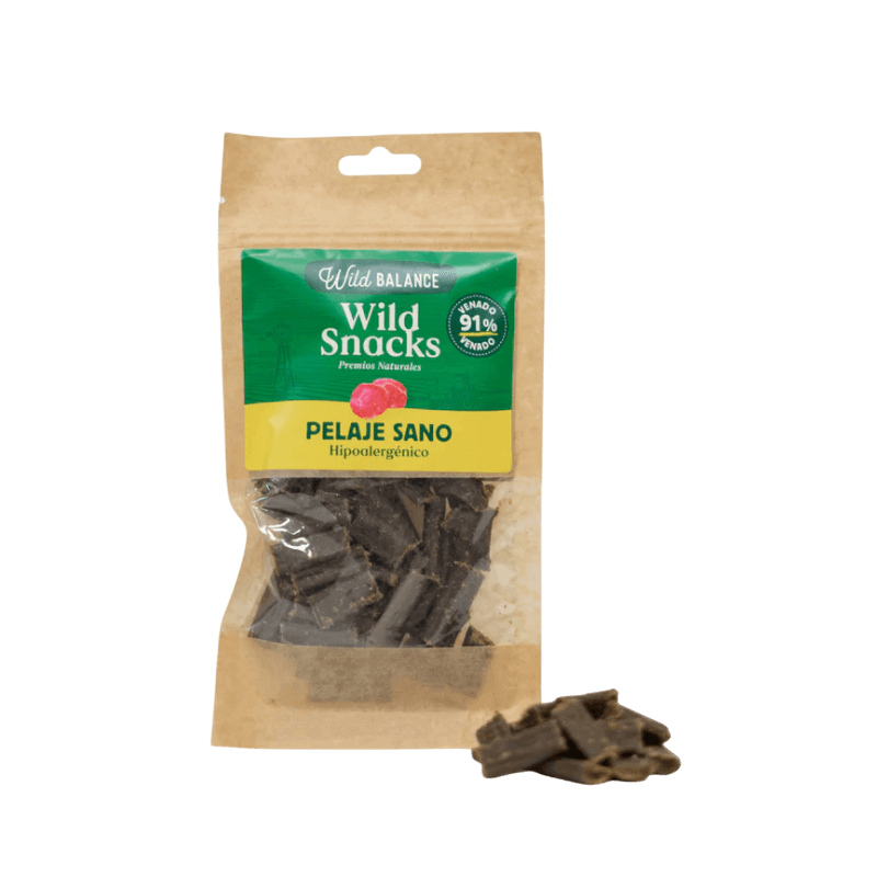 El Wild Balance Snack Pelaje Sano Venado es un suplemento nutricional diseñado para el bienestar dermatológico de tu perro. Este Snack Pelaje Sano Venado Perros es un premio funcional con más del 86% de carne, ideal para mejorar el brillo del manto, reducir la caída y dar soporte a la piel sensible.