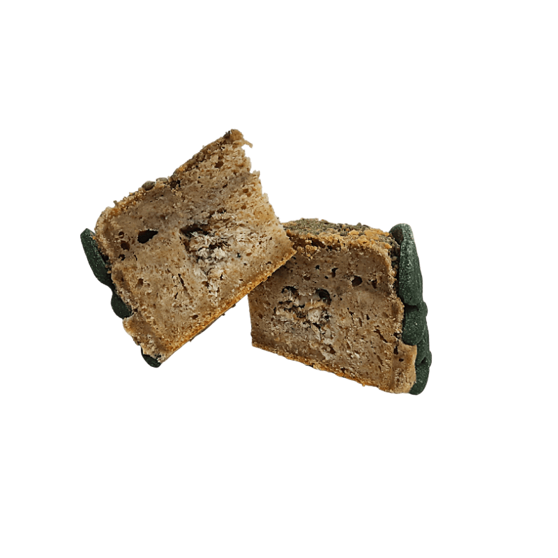 Cada tarta es horneada diariamente con ingredientes de consumo humano y rellena con trocitos de sardinas y caballa. 🎣 No usamos colorantes ni conservantes artificiales; el color verde proviene de la espirulina, una súper alga llena de beneficios. Además, es un producto Plastic Free ♻️, cuidando de tu mascota y del medio ambiente.