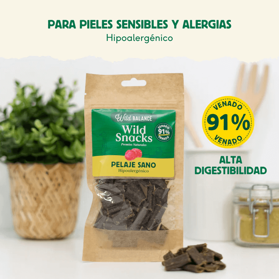 En Anlú sabemos que la belleza empieza en el interior. Los Wild Snacks Pelaje Sano de Venado están formulados pensando en esos perros que sufren de piel sensible o alergias alimentarias. Con un 91% de venado real, una proteína poco común y altamente digestible, reducimos al mínimo el riesgo de reacciones mientras le das un capricho de calidad superior.